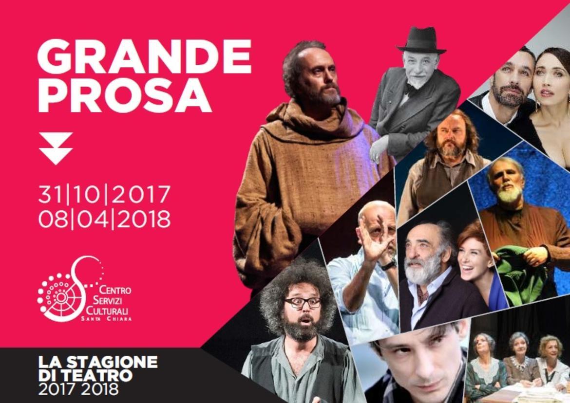 La Stagione sarà aperta da Il senso della vita di Emma che vede Fausto Paravidino in veste di autore, interprete e di regista della Compagnia Regionale, composta da professionisti nati, residenti o domiciliati nel Trentino - Alto Adige. Si tratta del secondo step di un progetto avviato lo scorso anno che è frutto della collaborazione delle tre principali istituzioni teatrali regionali: Il Teatro Stabile di Bolzano, il Centro Servizi Culturali S. Chiara e il Coordinamento Teatrale Trentino. Il cartellone GRANDE PROSA proseguirà poi al Teatro “Sociale” con Questa sera si recita a soggetto di Luigi Pirandello, testo “sperimentale” del grande drammaturgo siciliano diretto da Marco Bernardi, cui farà seguito Due, divertente botta e risposta fra una coppia di oggi, formata sul palcoscenico da Raoul Bova e Chiara Francini. Alla metà di dicembre tornerà al Teatro “Sociale” Marco Paolini col suo nuovo monologo Le avventure di Numero Primo e il 2018 della prosa si aprirà con la versione teatrale del romanzo Il casellante di Andrea Camilleri con Moni Ovadia fra gli interpreti. Alessandro Haber darà la voce e intensità drammaturgica al protagonista della commedia di Florian Zeller, tra i migliori drammaturghi francesi (premio Molière 2014), Il padre, e un eccezionale trio di attrici – Lucia PoliMilena Vukotic e Marilù Prati porterà sulla scena, nell’adattamento curato da Ugo Chiti, le Sorelle Materassi di Palazzeschi. La Stagione proseguirà con il sorprendente Smith & Wesson di Alessandro Baricco con Natalino Balasso, cui farà seguito Il nome della rosa, imponente spettacolo che Stefano Massini ha tratto dal romanzo capolavoro di Umberto Eco. Il decimo appuntamento stagionale avrà infine per protagonista il “cantattore” Simone Cristicchi con Il secondo figlio di Dio, la storia di David Lazzaretti, conosciuto come “Cristo dell’Amiata”.