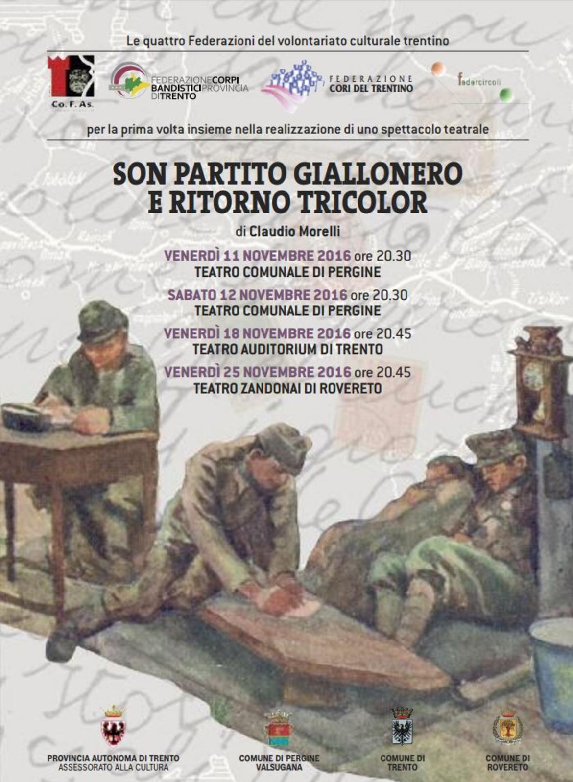 I quattro presidenti delle federazioni del volontariato trentino si sono incontrati nell'ambito di Cultura Informa per presentare lo spettacolo teatrale Son partito giallo nero e ritorno tricolor. In dialogo sono intervenuti per la Federazione delle Filodrammatiche, Gino Tarter; dei Cori, Paolo Bergamo; dei Corpi bandistici, Renzo Braus; e dei Circoli culturali e ricreativi, Elio Srednik. Sono entrati nel merito dell'allestimento scenico, che debutterà al Teatro Comunale di Pergine l'11 novembre prossimo, l'autore del testo drammaturgico, Claudio Morelli, e i registi Elena Galvani e Jacopo Laurino.