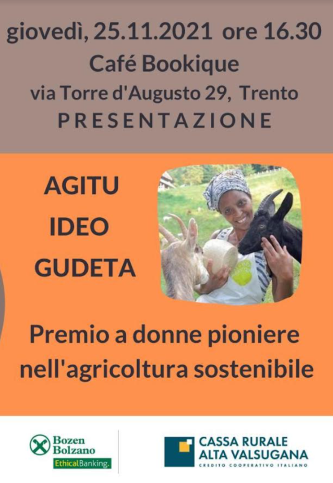 Conferenza Stampa di presentazione del progetto "AGITU IDEO GUDETA - Premio a donne pioniere nell'agricoltura sostenibile", promosso dall'Associazione Donne in Cooperazione in collaborazione con un gruppo di amici di Agitu dell’Alto Adige e del Trentino, che ha l’obiettivo di assegnare un premio annuale con un sostegno economico per le donne impegnate in attività innovative in agricoltura nella regione Trentino Alto Adige.