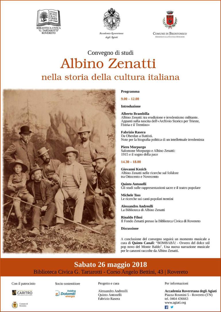 L’intellettuale al centro del convegno, Albino Zenatti (Trieste 1859 - Roma 1915), nato e formatosi a Trieste, era originario del Trentino: di Prada di Brentonico il padre, di Chizzola di Ala la madre. A queste radici, fortemente vissute sia sul piano culturale che su quello politico, furono dapprima legate le sue ricerche sui canti popolari e sulle rappresentazioni sacre.