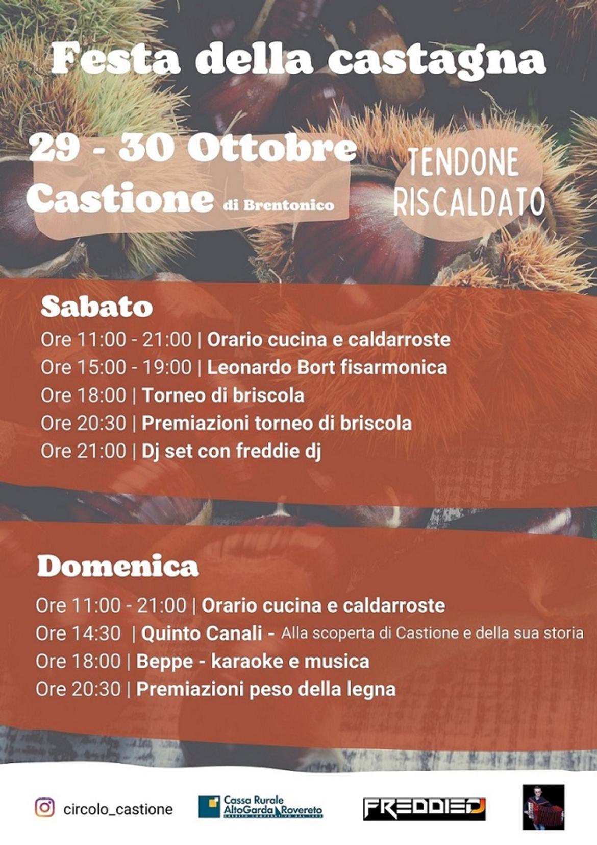È grazie al Circolo Castione e a davvero tante/i giovani se la festa della castagna di Castione ha ripreso negli ultimi anni la sua narrazione tradizionale e genuinità. L’edizione di quest’anno è organizzata nell’ultimo week end di ottobre, sabato 29 e domenica 30. Nei due giorni, dalle 11.00 alle 21.00, nel tendone riscaldato allestito presso il Circolo, sarà funzionante il servizio cucina e caldarroste. Inoltre: sabato 29 ottobre alle 15.00 musica con la fisarmonica di Leonardo Bort, alle 18.00 torneo di briscola (con premiazione alle 20.30), alle 21.00 Dj set con FreddieDJ; domenica 30 ottobre alle 14.30 conferenza storica e visita guidata al paese (ritrovo presso la chiesa), alle 18.00 karaoke e musica con Beppe, alle 20.30 premiazione della simpatica gara per indovinare il peso di un rimorchio di legna, che, in tempi di criticità energetiche, risulta anche un chiaro messaggio ecologico a favore della circolarità sostenibile dell’economia. È consigliabile raggiungere la festa di Castione a piedi o in bicicletta.