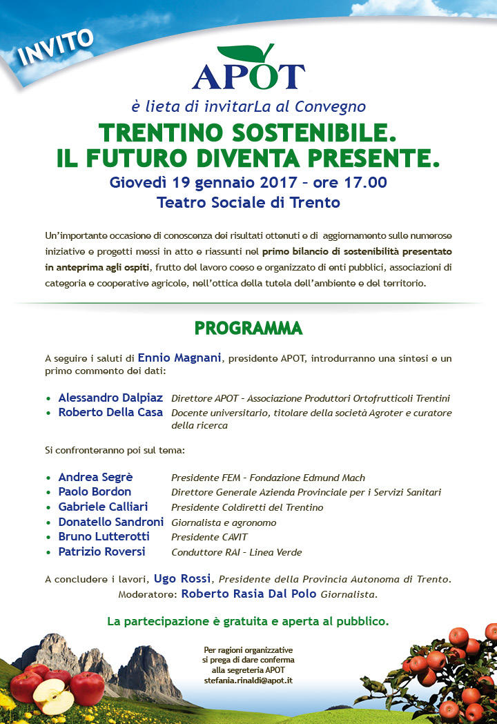 Alessandro Dalpiaz, direttore APOT e Assomela e Roberto Della Casa, docente universitario, titolare della società di ricerche Agroter, e curatore della ricerca illustreranno i dati di sintesi. A seguire, con la regia del giornalista Roberto Rasia dal Polo, un autorevole tavolo di confronto e commento sul tema ben rappresentato da Andrea Segrè, Presidente FEM – Fondazione Edmund Mach, Paolo Bordon, Direttore Generale Azienda Provinciale per i Servizi Sanitari, Gabriele Calliari, Presidente Coldiretti del Trentino, Donatello Sandroni, giornalista e agronomo, Bruno Lutterotti, Presidente CAVIT e Patrizio Roversi, noto conduttore RAI – Linea Verde. A concludere i lavori, interverrà Ugo Rossi, Presidente della Provincia Autonoma di Trento.