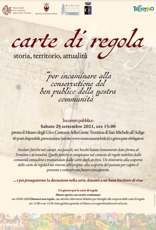 Il Museo di San Michele, in collaborazione con la Soprintendenza per i Beni culturali, propone dunque un itinerario alla scoperta delle carte di regola che è pure un ritorno alle origini e un invito a una cittadinanza attiva: alla scoperta del passato per capire il presente e costruire un futuro consapevole.