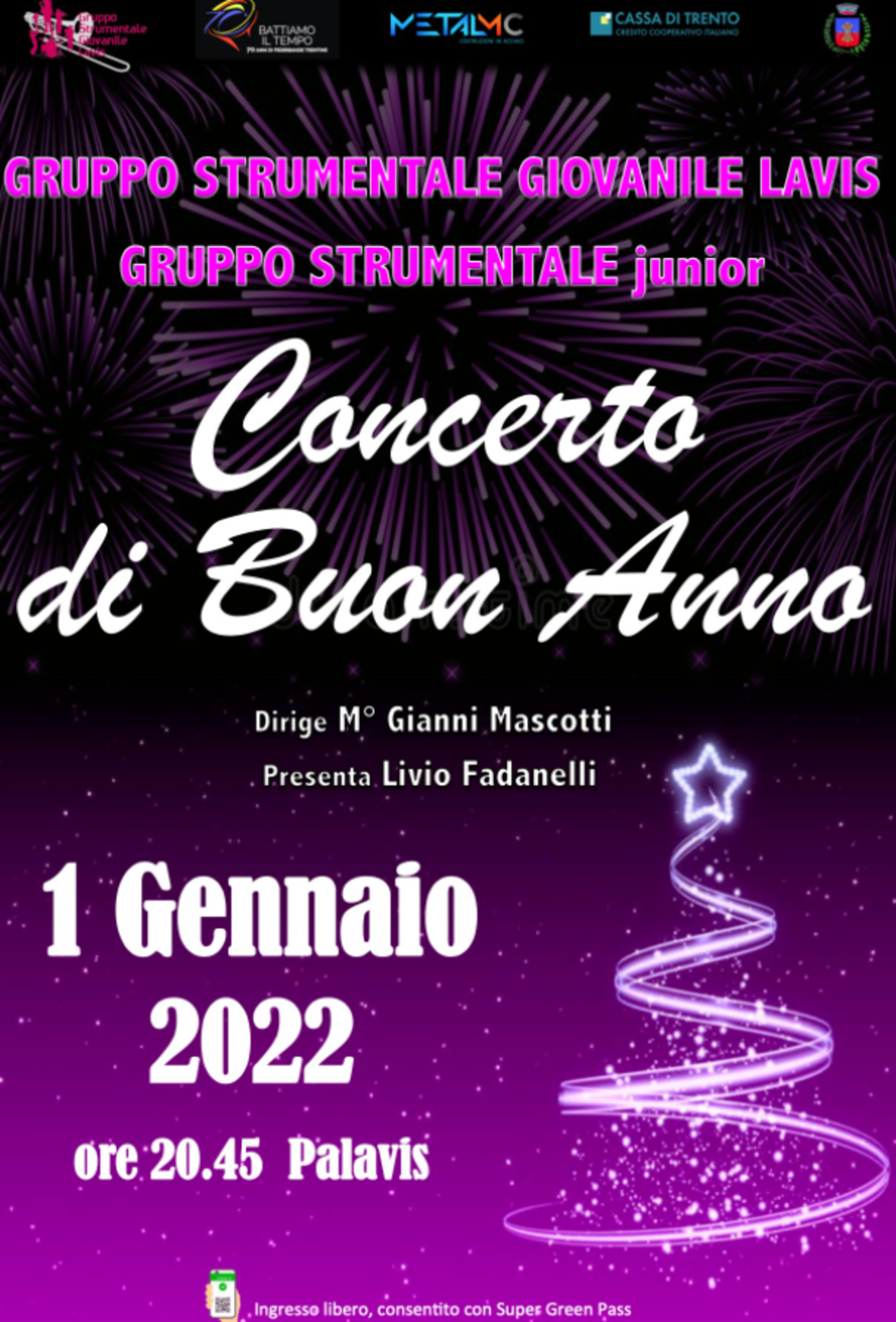 Il 1° Gennaio 2022 alle 20.45 il Gruppo Strumentale Giovanile di Lavis - GSGL vi aspetta al Palavis per il concerto di Buon Anno!