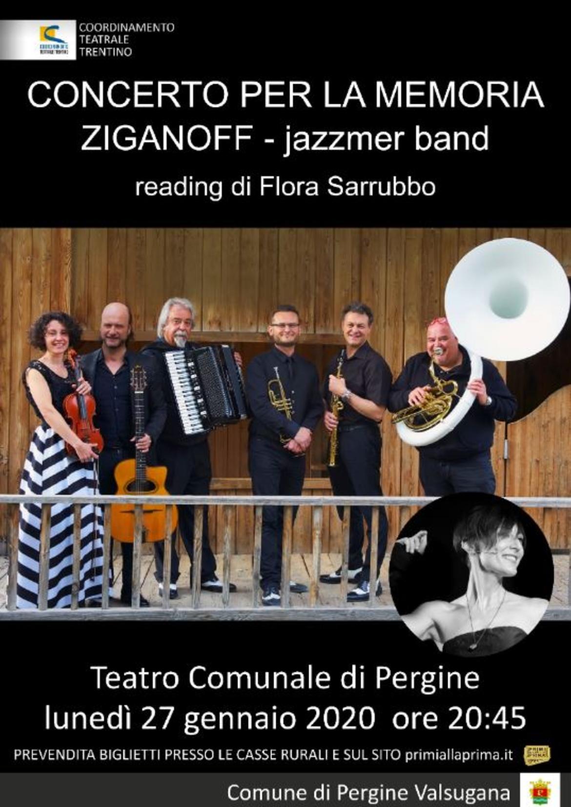 Il Comune di Pergine Valsugana in collaborazione con il Coordinamento Teatrale Trentino propone Concerto per la memoria con Ziganoff Jazzmer Band e reading di Flora Sarrubbo