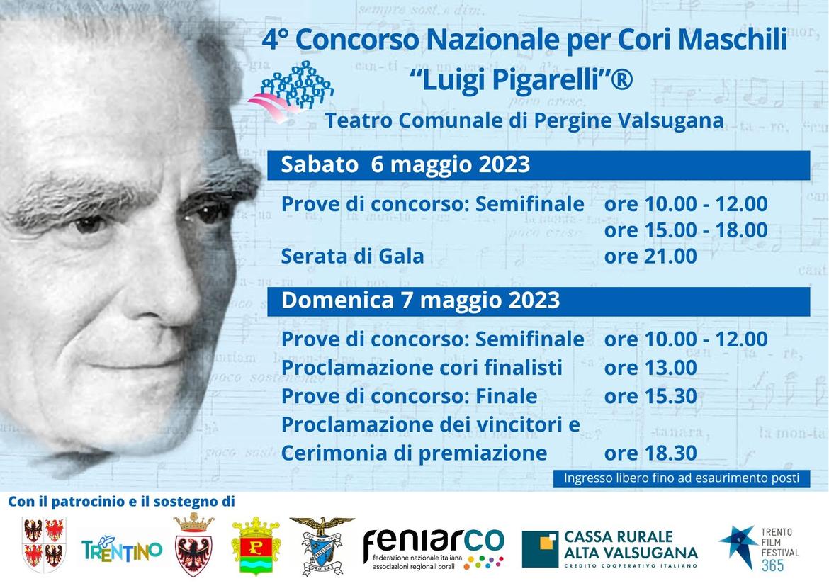 Saranno ben 56 i canti scritti dopo il 2000 da autori ancora viventi che risuoneranno sabato 6 e domenica 7 maggio a Pergine, il cui teatro comunale ospiterà la quarta edizione del concorso nazionale riservato a cori maschili e intitolato al grande compositore Luigi Pigarelli. Promosso dalla Federazione cori del Trentino il “Pigarelli”, unico concorso del genere in Italia, metterà a confronto 18 formazioni vocali maschili provenienti da sei diverse regioni (oltre al Trentino saranno rappresentati Veneto, Lombardia, Piemonte, Valle d'Aosta e Sardegna), selezionate tra diverse altri gruppi che si erano candidati a partecipare, da un'apposita commissione artistica formata da tre esperti maestri: Angelo Foletto, Sandro Filippi e Bruno Zanolini. Le porte del teatro di Pergine saranno gratuitamente aperte al pubblico sia in occasione delle semifinali del concorso, in programma sabato 6 maggio, che nella fase finale dei cori che si esibiranno domenica 7. “Anche con questa grande manifestazione puntiamo ad avvicinare i giovani al nostro mondo”, ha esordito il presidente provinciale di Federcori Paolo Bergamo. “Non a caso proprio in questo periodo la Federazione ha promosso la nascita del Coro Giovanile del Trentino, che parteciperà in rappresentanza di tutto il nostro territorio ad eventi organizzati in Italia e all'estero, e per cantare nel quale sono state raccolte 40 domande. Segno del sorprendente interesse che la coralità sa suscitare anche nelle nuove generazioni”. Bergamo ha ricordato infine che le prime tre edizioni del “Pigarelli”, in programma ogni due anni, si erano svolte ad Arco. E che dopo aver saltato l'edizione del 2021 a causa della pandemia, ora il concorso torna nella cornice di Pergine desiderando rilanciare con forza il valore non solo storico, tradizionale, ma anche attuale, culturale e sociale della coralità nella comunità provinciale.