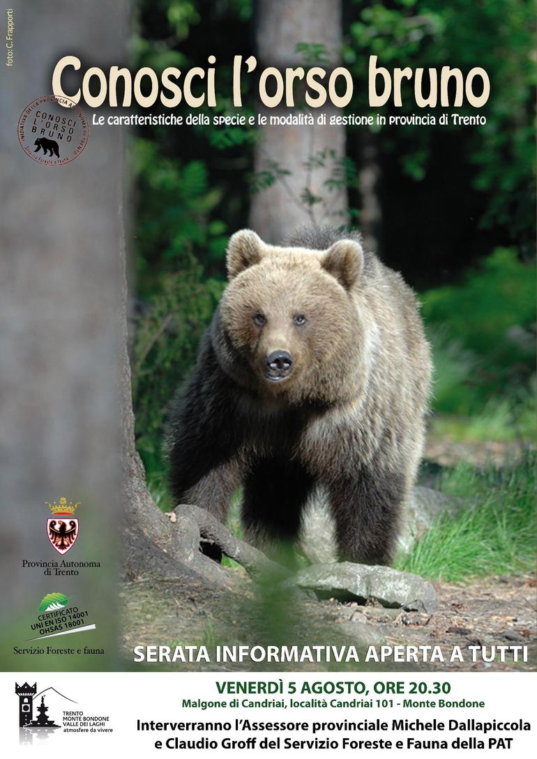“Conosci l’orso bruno. Le caratteristiche della specie e le modalità di gestione in provincia di Trento” è un’iniziativa della Provincia Autonoma di Trento e del suo Servizio Foreste e Fauna, che fa parte del piano di comunicazione per favorire la conoscenza della presenza dell’orso bruno sul territorio e ricordare utili regole di comportamento.