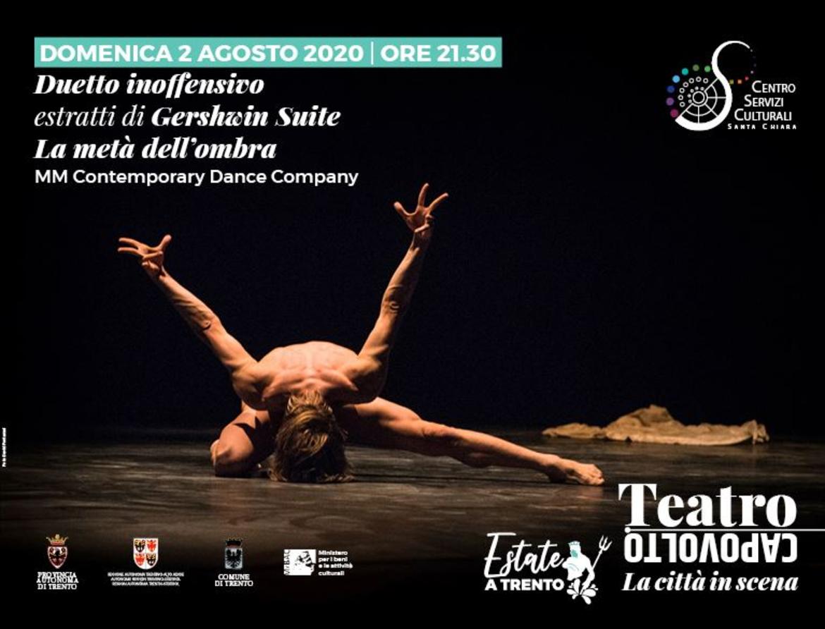 Sotto il titolo CONTEMPORARY MEN la MM Contemporary Dance Company presenta una serata tutta al maschile, portando in scena tre coreografie di grande successo: DUETTO INOFFENSIVO di Mauro Bigonzetti (estratto da “Rossini Cards”), rimontato per la MMCDC, alcuni estratti di GERSHWIN SUITE di Michele Merola, e il pluripremiato LA META’ DELL’OMBRA, sempre di Merola, direttore della compagnia.