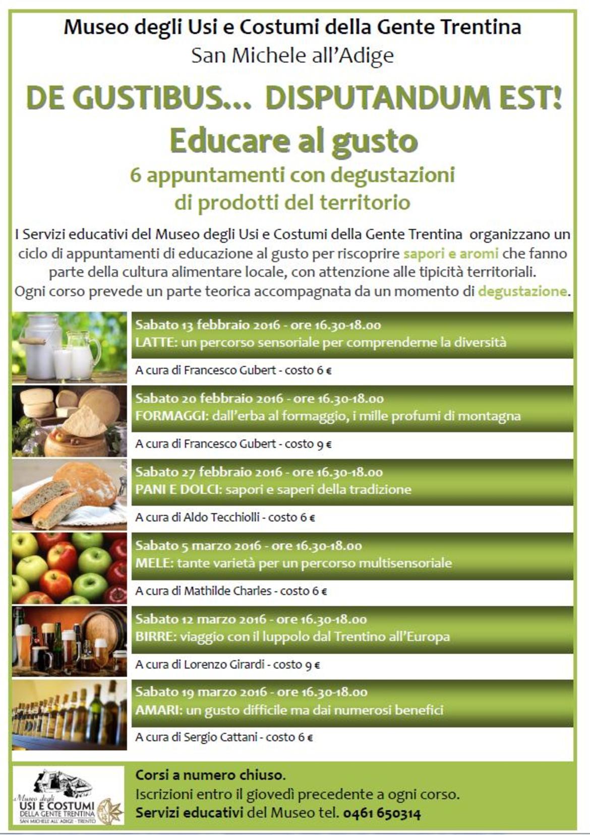 I Servizi educativi del Museo degli Usi e Costumi della Gente Trentina organizzano un ciclo di appuntamenti di educazione al gusto per riscoprire sapori e aromi che fanno parte della cultura alimentare locale, con particolare attenzione alle tipicità territoriali: "DE GUSTIBUS… DISPUTANDUM EST! Educare al gusto. 6 appuntamenti con degustazioni di prodotti del territorio"