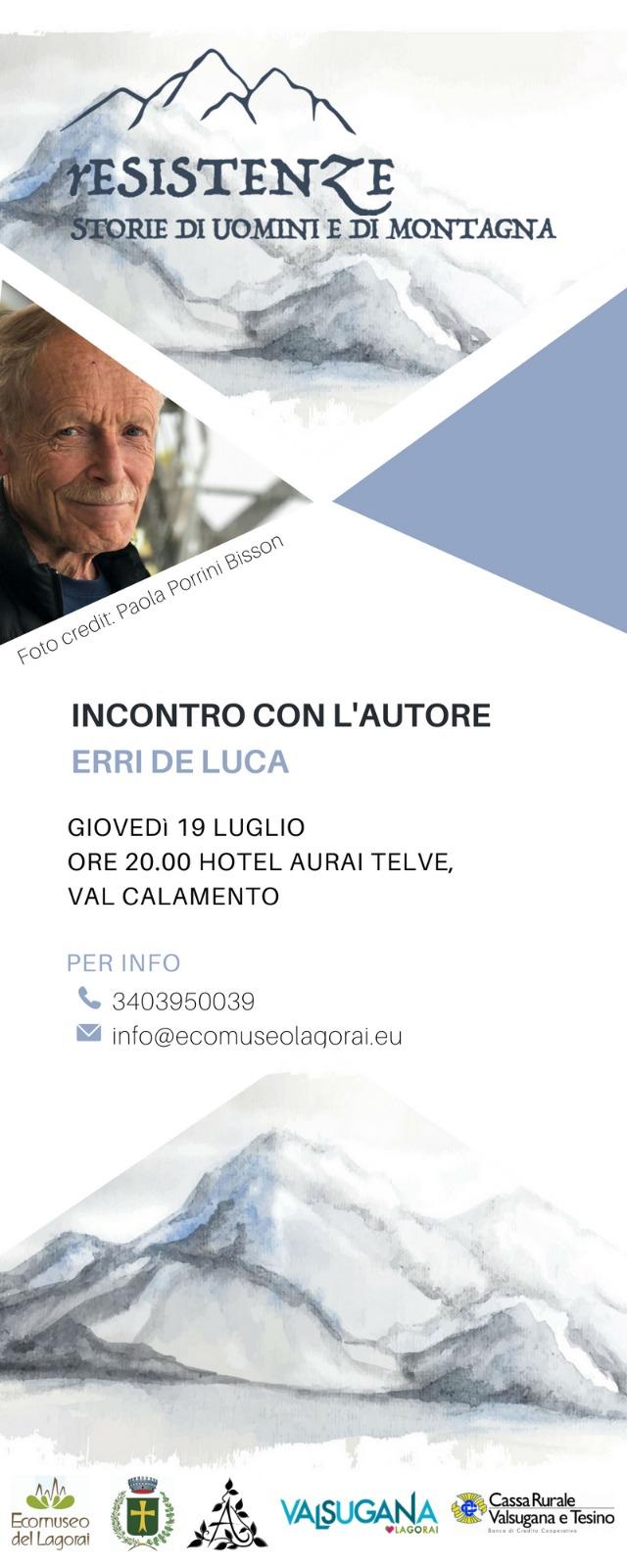 La manifestazione "rESISTENZE, storie di uomini e di montagna" vuole raccontare storie di uomini e del loro vivere la montagna. Lo scrittore, lo studioso, la guida alpina: l’uomo di fronte alla grandezza, meravigliosa ma a volte spietata, della montagna. Tre protagonisti, tre uomini, tre mondi: la montagna come luogo del cuore dove l’uomo rEsiste.