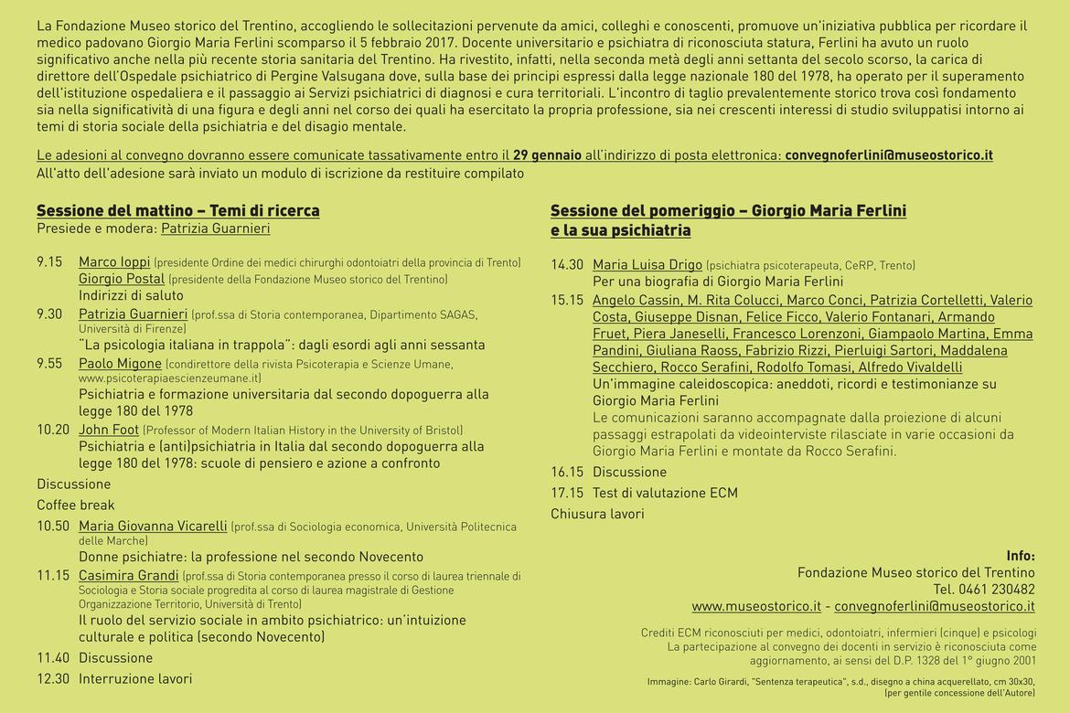 In questa occasione si terrà una giornata di studio in ricordo del medico padovano Giorgio Maria Ferlini, scomparso un anno fa che, nell'arco della sua lunga carriera di neuropsichiatra, psicoterapeuta e docente universitario, ricoprì anche il ruolo di direttore dell'Ospedale psichiatrico di Pergine Valsugana (dal 1975 al 1978).