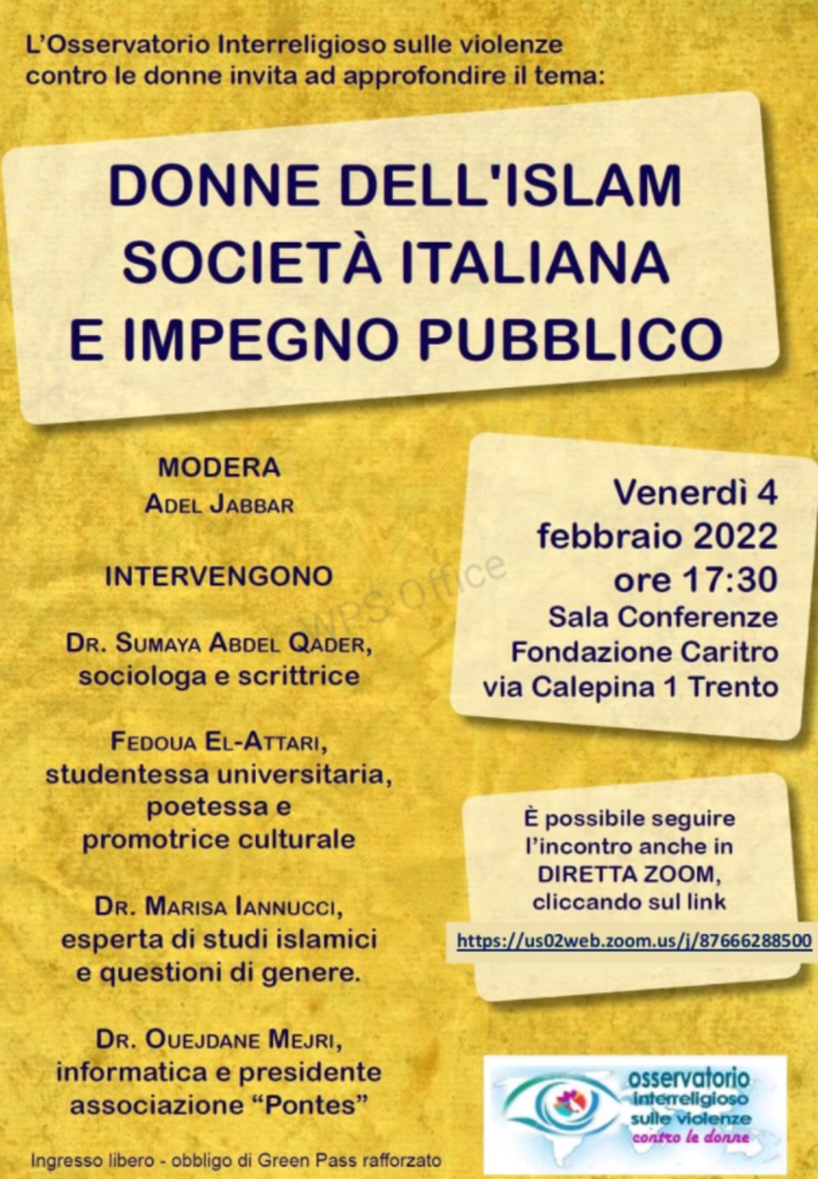 L’incontro, moderato da Adel Jabbar, vedrà la partecipazione di Sumaya Abdel Qader, sociologa e ricercatrice, Fedoua El-Attari, poetessa e promotrice culturale, Marisa Iannucci, esperta di studi islamici e questioni di genere e Ouejdane Mejri, informatica e presidente dell’associazione Pontes.