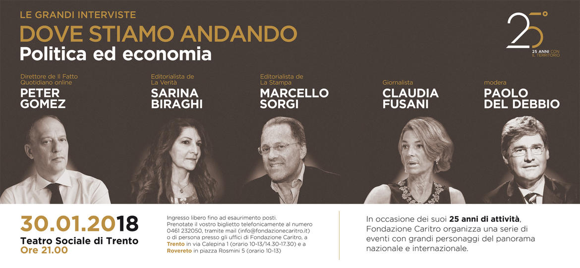 “Dove stiamo andando, politica ed economia” è una frase che esprime una preoccupazione molto diffusa e sentita, legata al clima di incertezza e di cambiamento che stiamo vivendo. Ma è anche e soprattutto il titolo che dà vita ad un evento che la Fondazione Caritro, nell’ambito dei festeggiamenti per i primi 25 anni di attività, propone per martedì 30 gennaio con ingresso libero previa prenotazione.