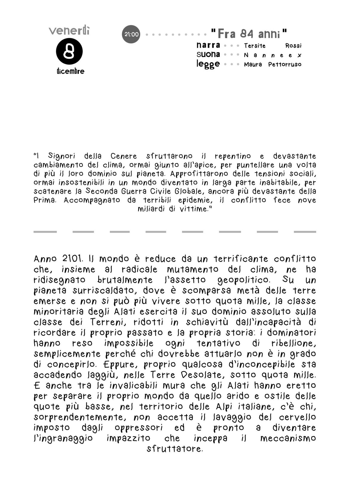 All'interno del festival NarraBaldo, letteratura musicata a Brentonico, un racconto distopico di Tersite Rossi, letto da Maura Pettorruso e accompagnato dalla musica elettronica di Johannes Pfaender, in arte Nanneex.
