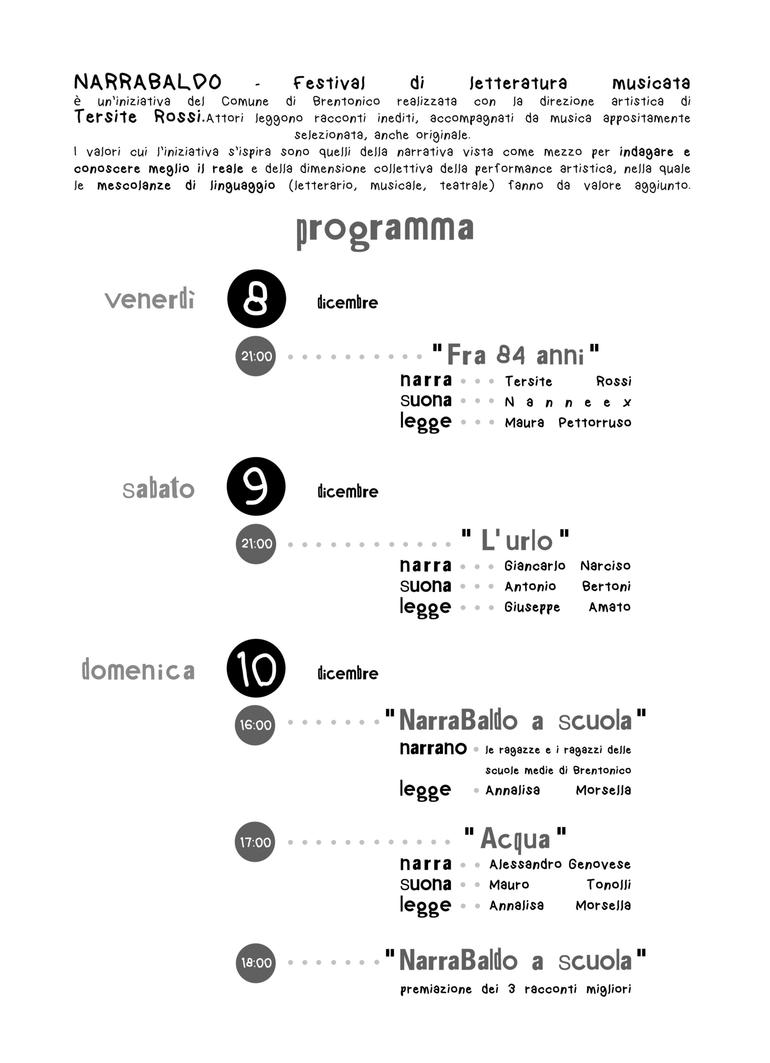 “Abbiamo voluto puntare su un’iniziativa del tutto nuova”, aggiunge l’Assessore alla Cultura e Istruzione del Comune di Brentonico Quinto Canali, “ricca di contenuto artistico, nell’idea che l’ente pubblico sia il primo a dover investire su arte e cultura, tanto più in tempi di tagli e ristrettezze come questi. Il nostro intento è che questa di NarraBaldo sia la prima di numerose edizioni future”.