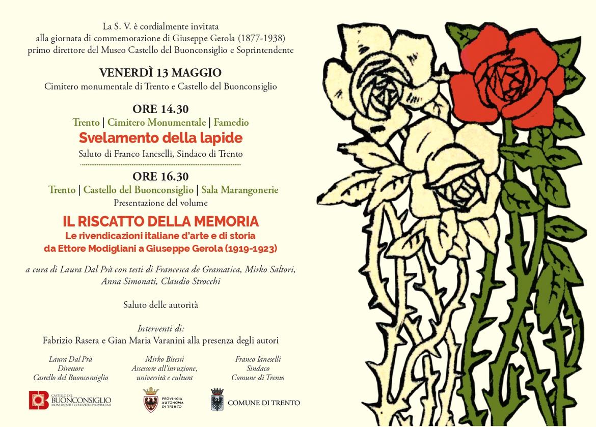 Nell’occasione, grazie alla disponibilità del professore Gian Maria Varanini, già docente dell’Università di Verona e di Trento, nonché fine studioso della sua opera, e del professore Fabrizio Rasera, noto storico roveretano, sarà presentato il volume appena edito a cura del Museo dal titolo: Il riscatto della memoria. Le rivendicazioni italiane d’arte e di storia da Ettore Modigliani a Giuseppe Gerola (1919 – 1923)