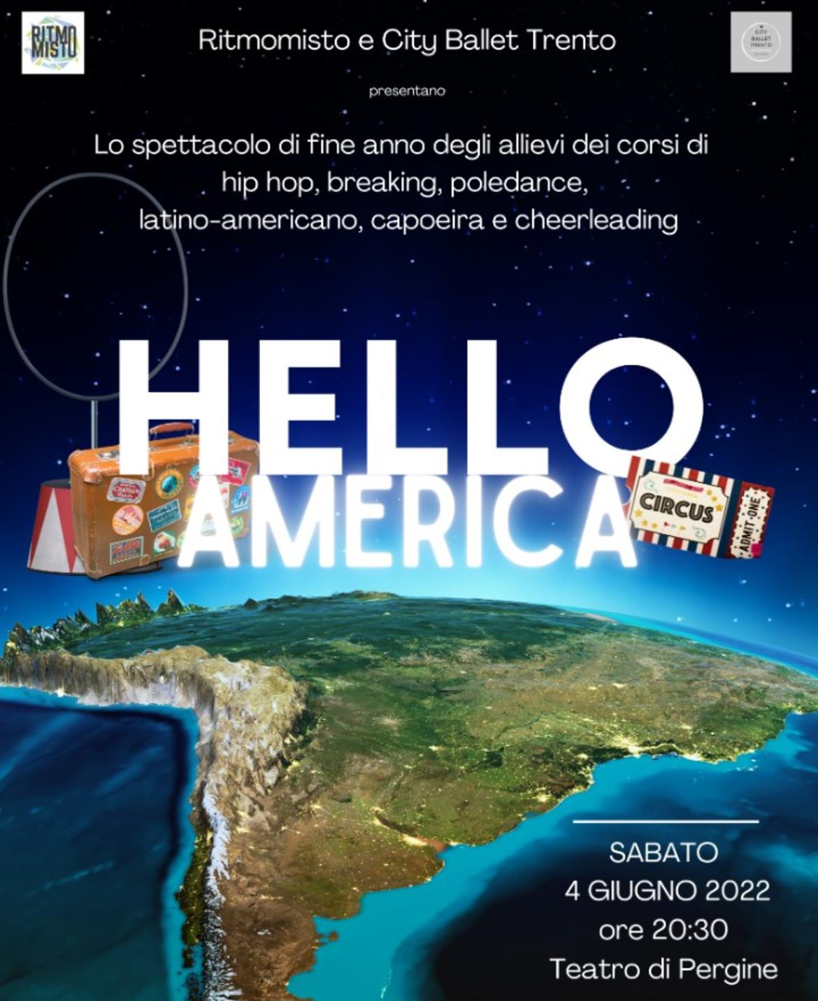 HELLO AMERICA!: Spettacolo degli allievi di hip hop, breaking, cheerleading, poledance, latino-americano e capoeira di Ritmomisto e City Ballet Trento. Un viaggio nelle Americhe a bordo di una carovana circense molto speciale. Coreografie di Sergio Reolon, Domenico Leonello, Debora Brugnara, Giada Moser, Silvia Padovan. Micro Boccaletti, Paulo H. Cruz.