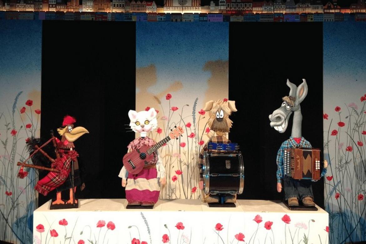 Con queste parole inizia lo spettacolo I musicanti di Brema. In scena, un campo di papaveri a perdita d’occhio, la città tedesca all’orizzonte e pupazzi che suonano meravigliose musiche della tradizione folk francese. L’Asino suona l’organetto, il Cane la grancassa, il Gatto l’ukulele, il Gallo la cornamusa. Anche i briganti suonano: la chitarra elettrica!