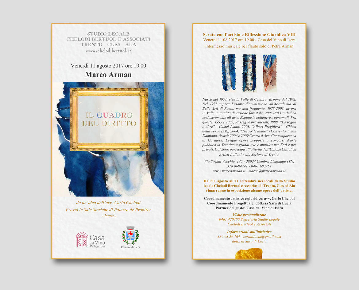 Venerdì 11 agosto 2017 ad ore 19.00 presso la Casa del Vino di Isera sarà presentato l'appuntamento con l'Artista per il ciclo di incontri con arte e diritto, organizzato dallo Studio legale Chelodi-Bertuol e Associati.