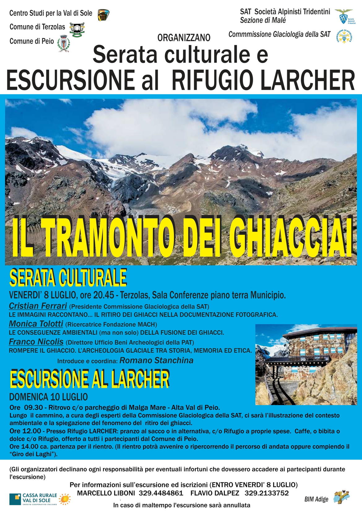 Torna, dopo i due anni di stop causa pandemia, la così detta “Due Giorni” (serata culturale ed escursione) copromossa dal Centro Studi per la Val di Sole, dalla SAT Sezione di Malé, dalla Commissione Glaciologica SAT e dai Comuni di Terzolas e Peio. “Il tramonto dei ghiacciai”: questo il titolo dell’iniziativa con la quale si punterà a conoscere l’ormai eclatante fenomeno della fusione dei ghiacciai, del ritiro degli stessi e delle conseguenze che ne derivano.