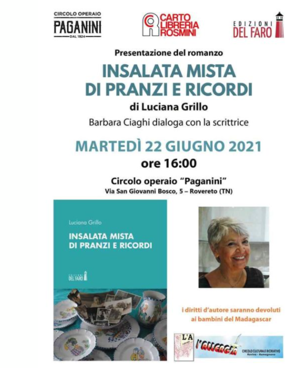 Siamo felici di questa nuova collaborazione con il Circolo operaio Paganini di #Rovereto!Martedì pomeriggio saremo nel loro accogliente spazio esterno per parlare con Luciana Grillo del suo #romanzo "Insalata mista di pranzi e ricordi".Saremo affiancati dalla Cartolibreria Rosmini e dall'associazione Circolo Allergia che presenterà il progetto “Madagascar - Un insegnante per tutti” a cui l’autrice generosamente devolve i diritti d’autore.Vi aspettiamo!