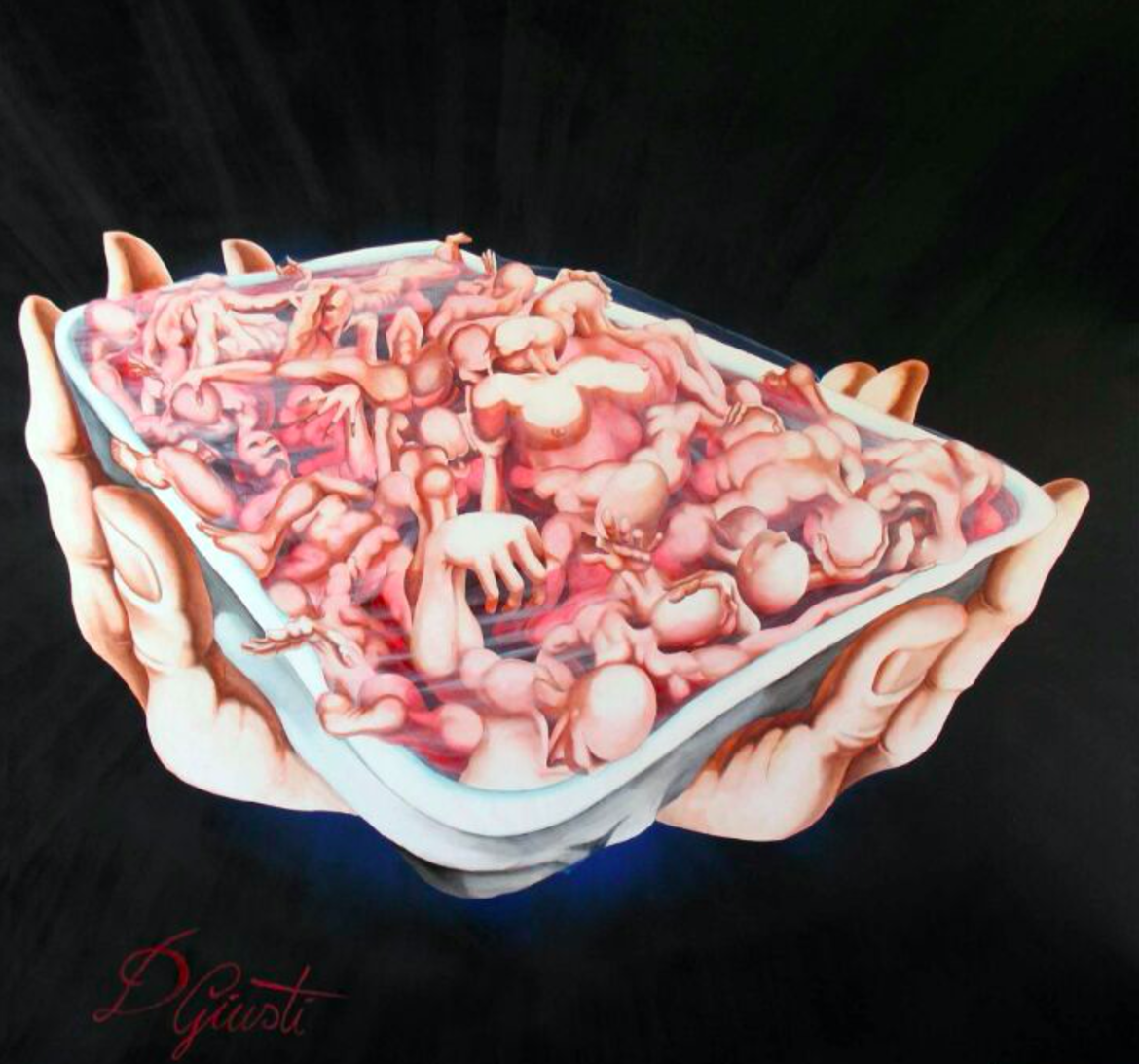 Utopie di solidarietà si manifestano in immagini arcane, disperse in viaggi cosmici come meteore ancestrali. Sono gli accorati spazi di humanitas creati da Domenico Giusti a suggerirci riflessioni universali, affioranti da un microcosmo pittorico senza prologhi né epiloghi.