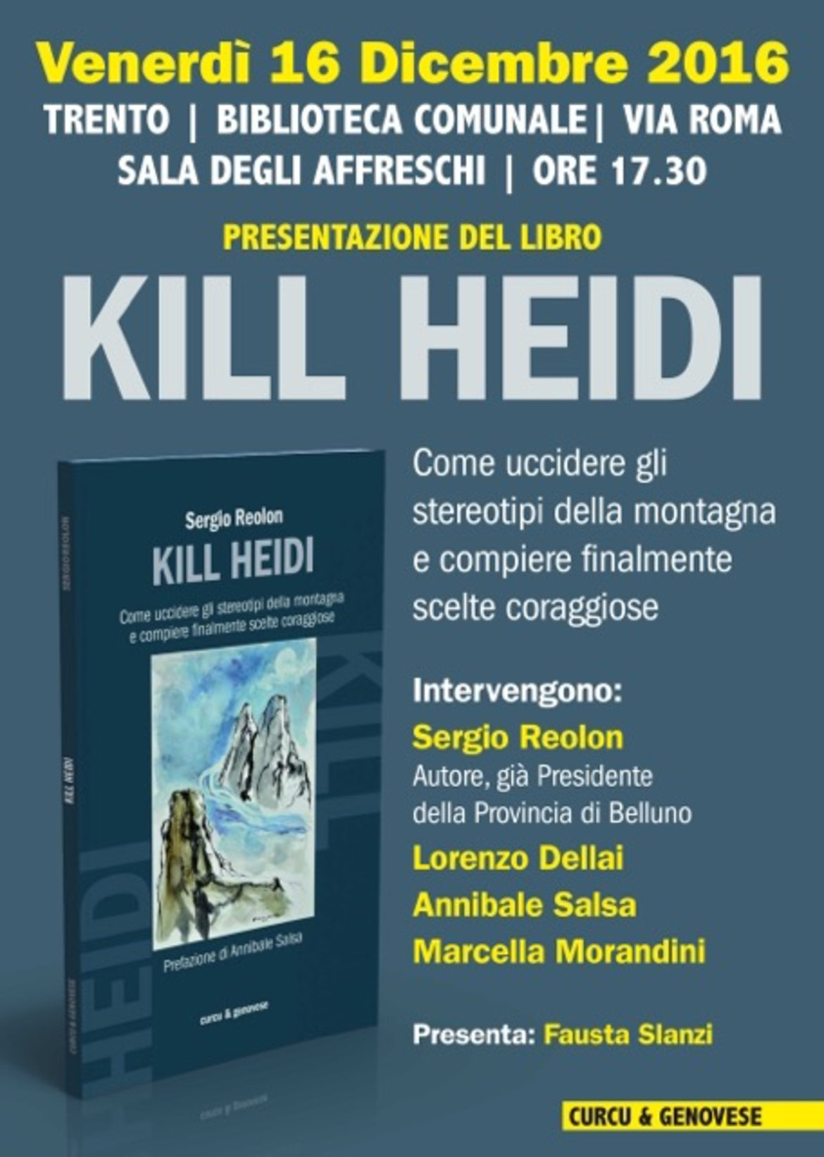 È oramai giunto alla terza edizione in tre mesi il libro “Kill Heidi. Come uccidere gli stereotipi della montagna e compiere finalmente scelte coraggiose”, piccolo e curioso ma tagliente pamphlet scritto da Sergio Reolon, che contiene anche testi di altri studiosi, tra cui il compianto Edmondo Berselli. La prefazione è curata dall’antropologo Annibale Salsa.