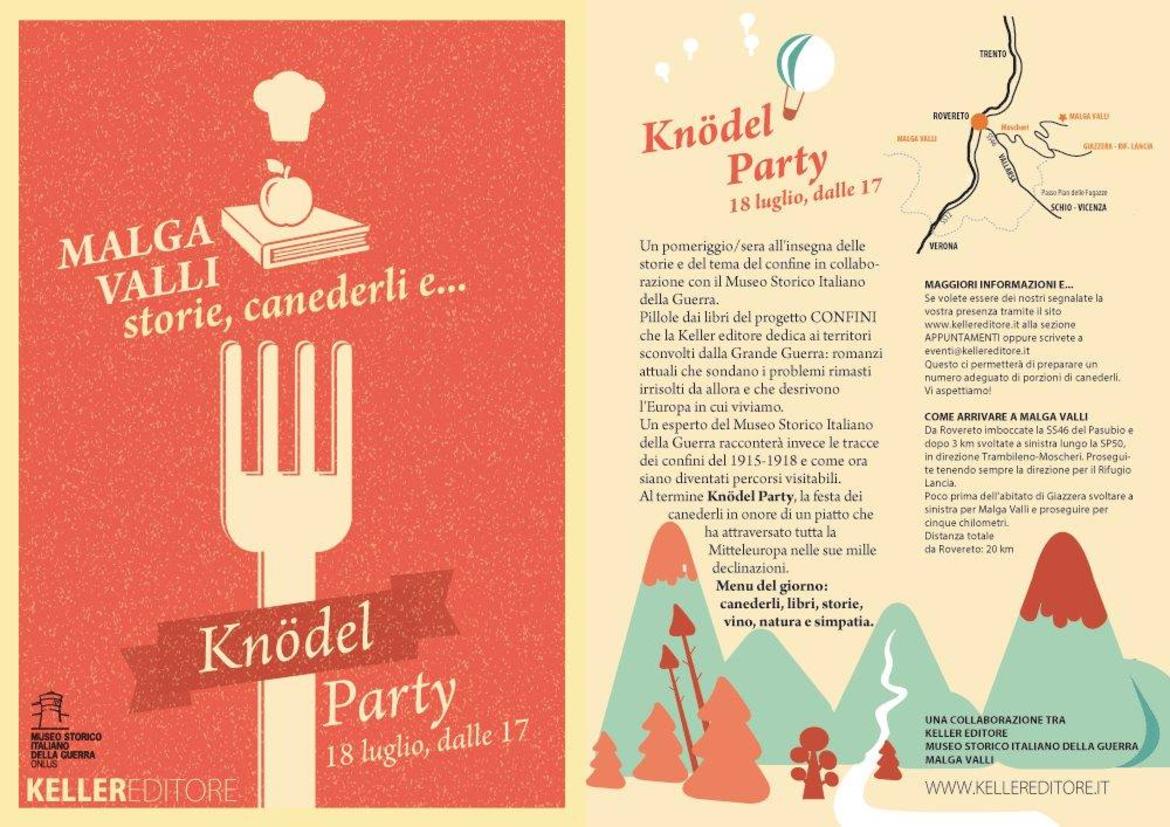 Da una collaborazione tra la Keller editore, il Museo Storico Italiano della Guerra e Malga Valli (Tn) una iniziativa per affrontare in modo diverso il tema del confine della Grande Guerra, con un occhio a 100 anni fa e l'altro al presente. Al termine una degustazione di canederli (knödel) uno dei piatti simbolo della Mitteleuropa.