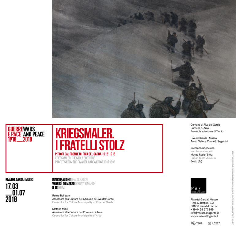 La mostra Kriegsmaler. I fratelli Stolz rientra nel progetto Guerre e Pace. 1918-2018 che il MAG nel 2018 dedica al centenario della fine della Prima guerra mondiale e che si articola in tre mostre dispiegate in diversi momenti negli spazi del Museo di Riva del Garda e in una variegata proposta di appuntamenti dalla primavera all’autunno presso i forti del Monte Brione ubicati lungo il Sentiero della Pace a Riva del Garda.