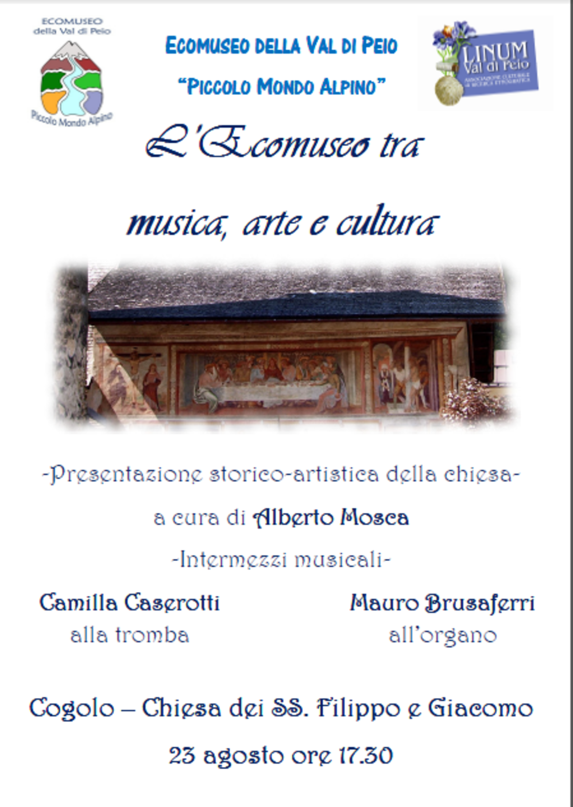 Alberto Mosca ci accompagnerà attraverso secoli di storia e strati d'arte, mentre le sue spiegazioni si alterneranno alle note suadenti di Mauro Brusaferri all'organo e Camilla Casertotti alla tromba.