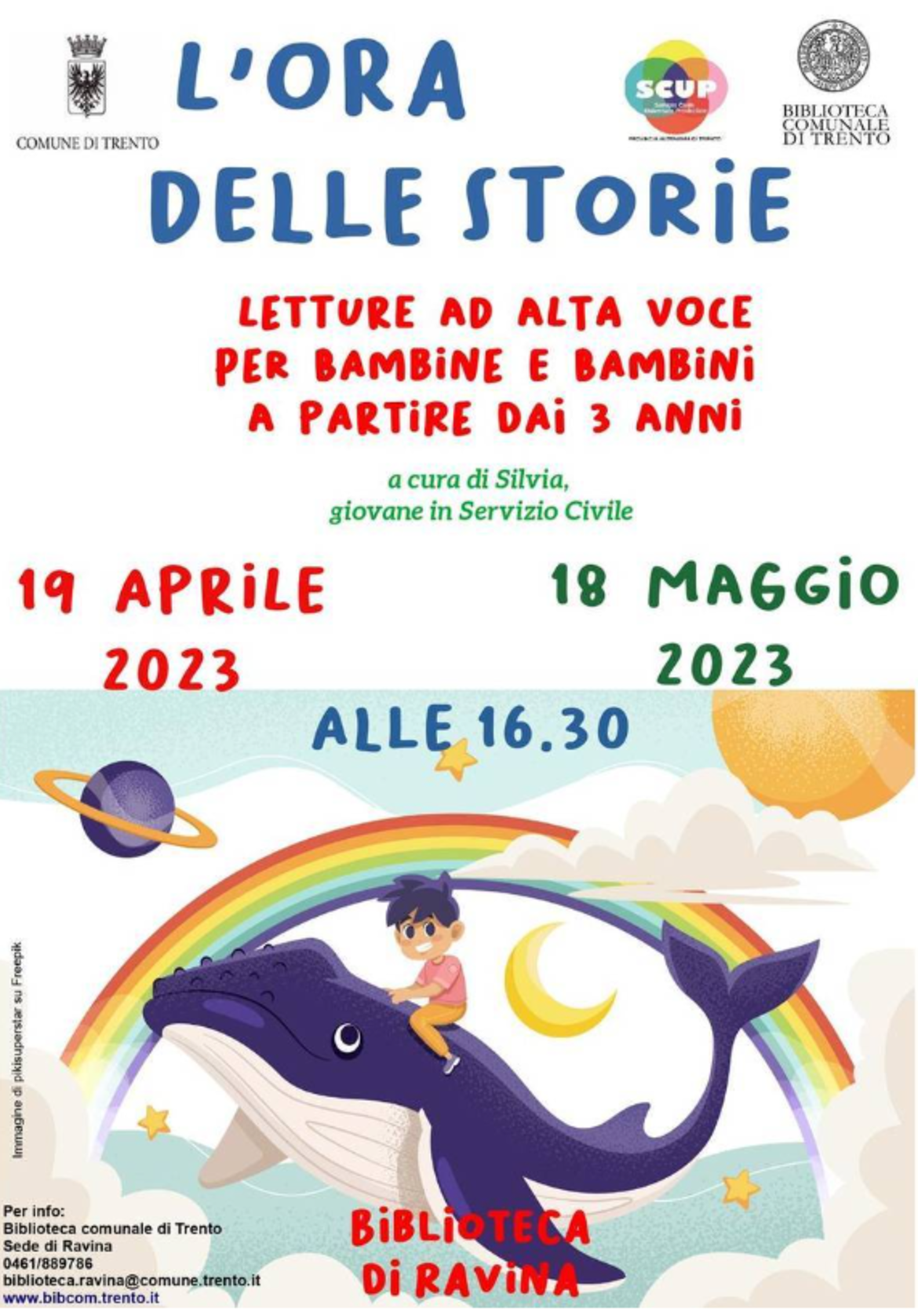L'ingresso è libero, previa prenotazione al numero 0461-889786 o via mail all'indirizzo mail biblioteca.ravina@comune.trento.it