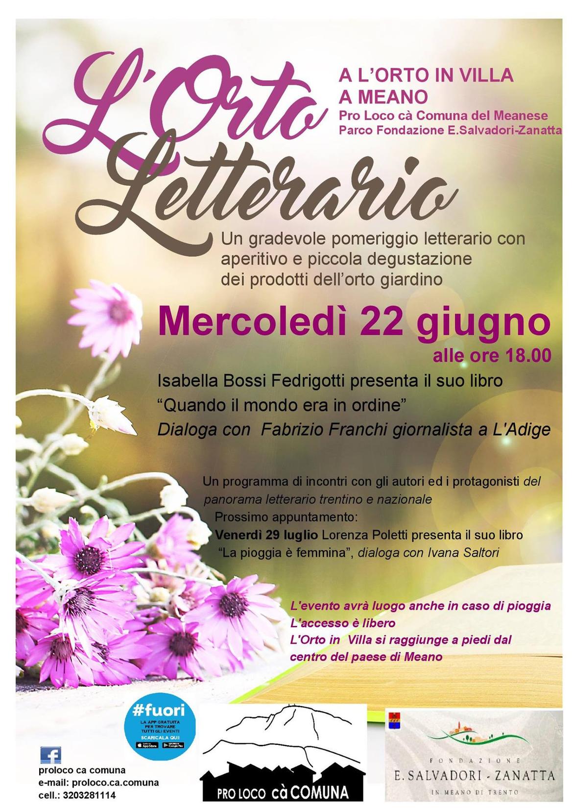 La Pro Loco Ca Comuna del Meanese e Parco Fondazione Salvadori Zanatta invitano alla presentazione del libro "Quando il mondo era in ordine" di Isabella Bossi Fedrigotti che dialogherà con Fabrizio Franchi giornalista dell'Adige.