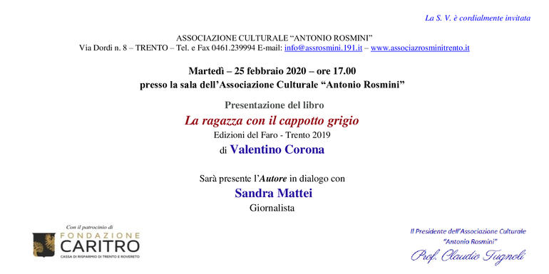Chi è la ragazza con il cappotto grigio? Il romanzo di Valentino Corona è il percorso tormentato dell’attraversamento di una crisi per molti aspetti indecifrabile nei rapporti con il passato, con se stessi e con il mondo. La conclusione della vicenda è inattesa e sorprendente.