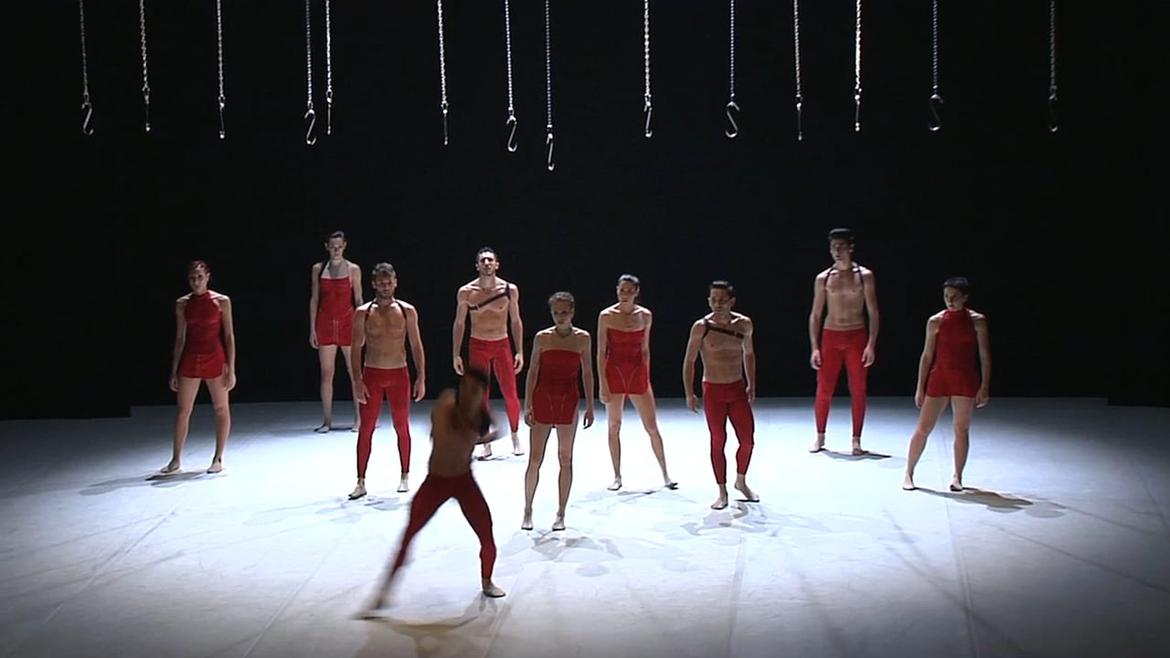 Sulla nuda scena, emergono dal buio e incombono dal soffitto, come unico elemento, lugubri ganci da mattatoio. Sono altrettante spade di Damocle, un monito severo che ci invita a guardare al passato, ad un tempo in cui tanti, troppi uomini sono stati mandati al macello, sacrificati a ideologie di morte e terrore, considerati numeri senza identità, corpi derubati della propria dignità.L’assunto della coreografia è tutto qui: sino a quando l'essere umano sacrificherà i propri simili alla violenza del cieco cannibalismo, e non sceglierà la via del rispetto dell'altro, la luce della cultura e la chiarezza della ragione non potranno prendere il sopravvento. Se ciò non avverrà, ciascun individuo potrà solo pensare e volere il male degli altri; eliminare chiunque si ponga in ostacolo al soddisfacimento dei propri desideri.