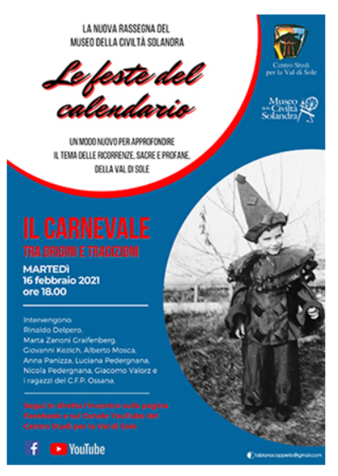 Il secondo appuntamento è in programma martedì 16 febbraio alle ore 18.00 ed è dedicato a “Il carnevale tra origini e tradizioni“. L’incontro viene trasmesso sulla pagina Facebook e sul Canale You Tube del Centro Studi per la Val di Sole