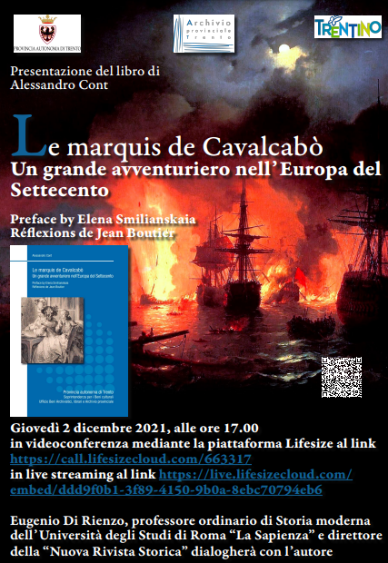 Le marquis de Cavalcabò: il libro appena edito dall’Ufficio beni archivistici, librari e Archivio provinciale di Trento ricostruisce minutamente l’avvincente biografia di Giorgio Baroni Cavalcabò (Sacco presso Rovereto, 1717-Parigi, 1799), uno dei grandi avventurieri dell’Età dei Lumi e un personaggio sfuggente ed enigmatico della storia trentina.