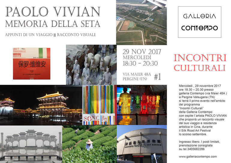 In questo incontro Paolo Vivian proporrà un racconto visuale del suo viaggio e residenza artistica in Cina durante il Silk Road Art Festival dove ha visitato l’Esercito di terracotta in XiAn, il Museo del Bronzo, e i vecchi rioni. Il viaggio e la mostra alla citta di Songyang, dove ci sono le grandi piantagioni di te' verde conosciuto in tutto il mondo.antichi villaggi e performance artistiche.