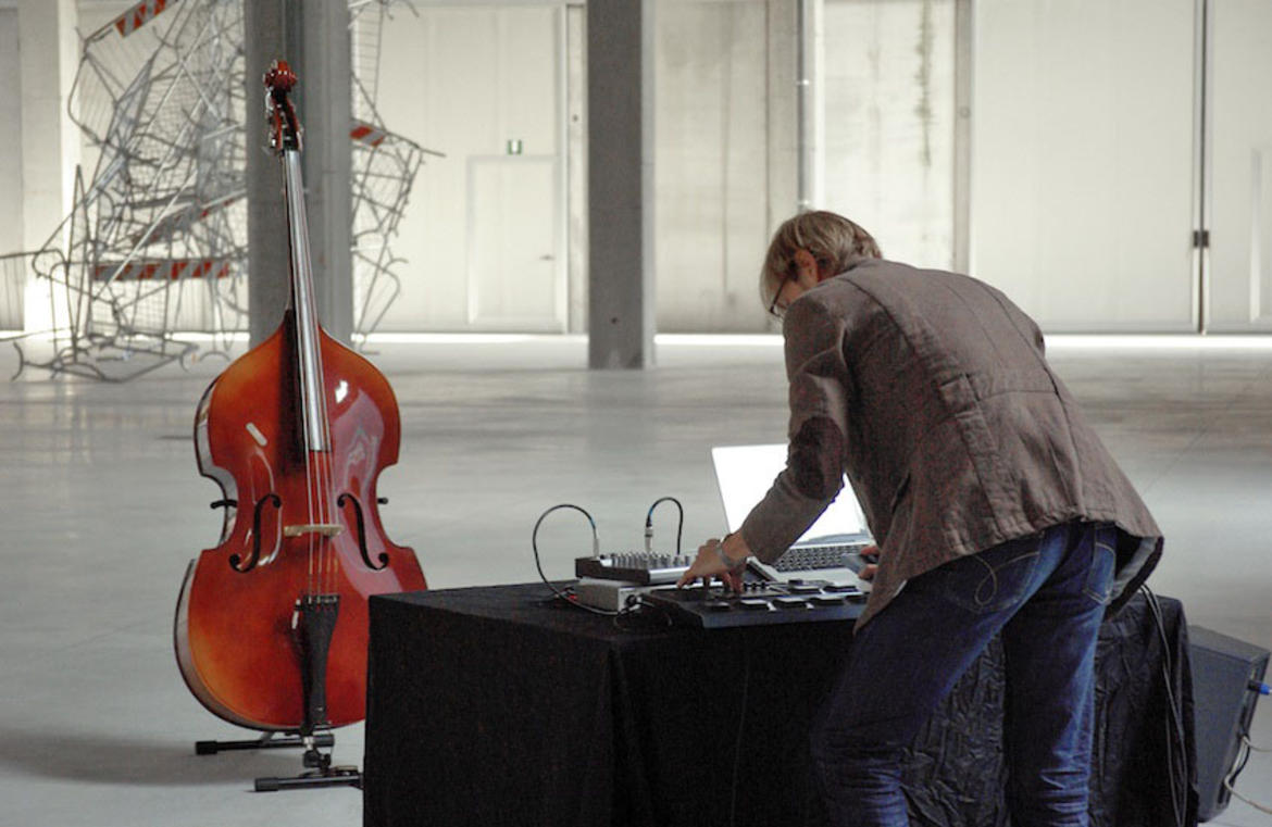 Nella performance Desmodrone di Michele Spanghero (1979, Monfalcone), il contrabbasso smette di essere lo strumento in cui nasce il suono per svolgere essenzialmente il ruolo di cassa armonica. Il gesto tecnico (l’esecuzione sullo strumento ad arco) viene portato al grado zero utilizzando il legno e le corde senza mai toccarle direttamente, agendo esclusivamente attraverso la fisica del suono. La performance nasce dalla diffusione di alcune onde sinusoidali che fanno risuonare lo strumento: le vibrazioni del contrabbasso diventano quindi un segnale acustico per il computer che innesca un effetto Larsen. La tessitura sonora così si dilata e si stratifica con variazioni microtonali e battimenti armonici che entrano in dialogo con l’acustica del luogo.