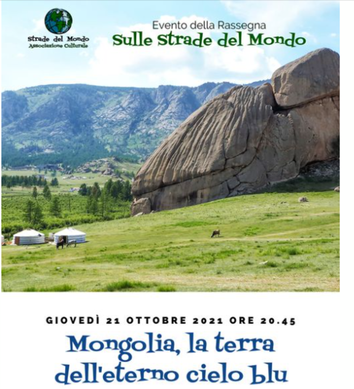L'associazione Strade del Mondo di Levico è lieta di invitarvi alla seconda edizione della rassegna autunnale "Sulle strade del mondo". Nella prima serata andremo a scoprire da vicino le bellezze della Mongolia, definita "la terra dell'eterno cielo blu."A farci da guida tra le meraviglie di questa nazione, sarà Enkhmaa Enkhbat docente di lingua e cultura mongola e fondatrice del circolo culturale Mongol Toli