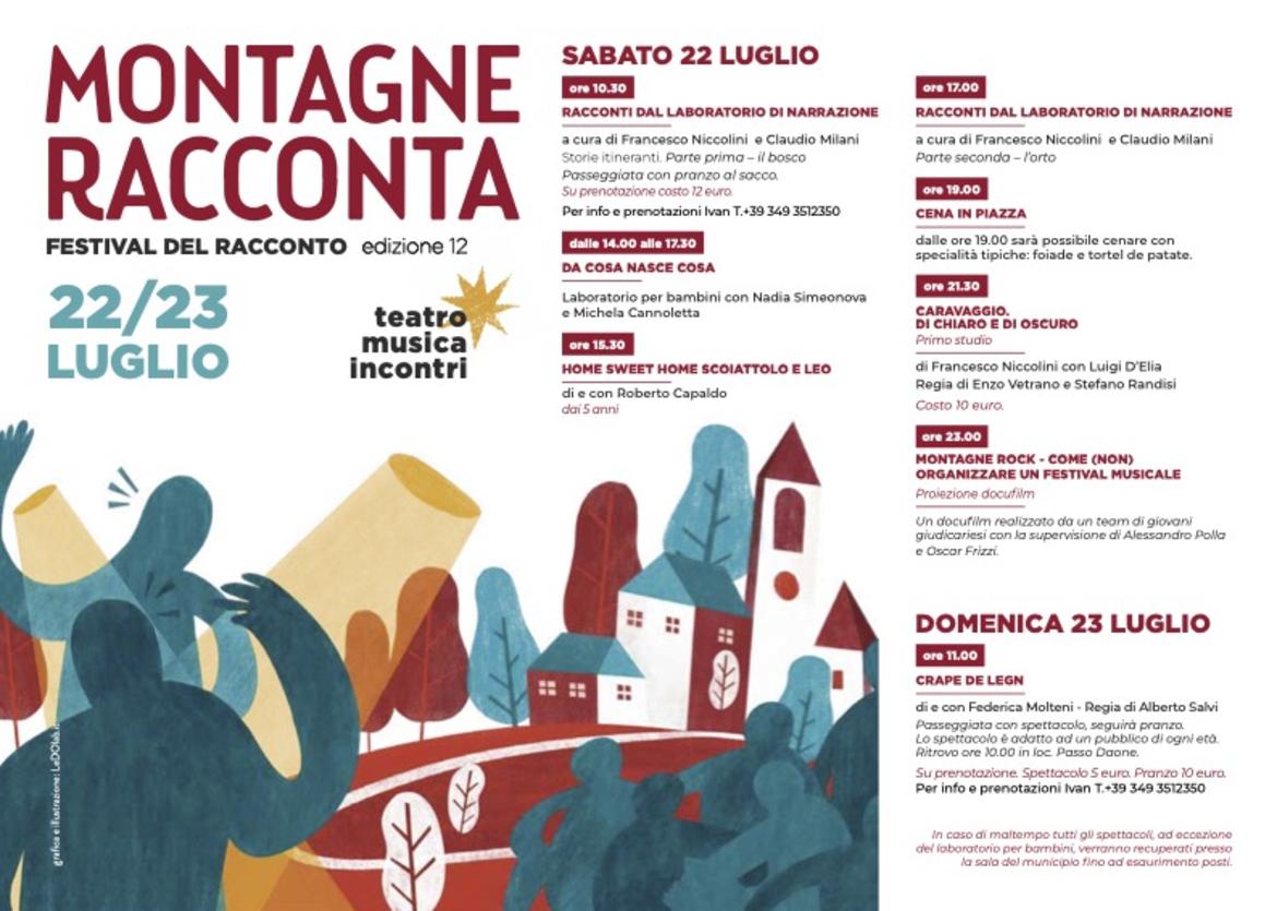 Il programma della dodicesima edizione del Festival Montagne Racconta che si svolgerà sabato 22 e domenica 23  luglio 2023 a Montagne, frazione di Tre Ville (TN).