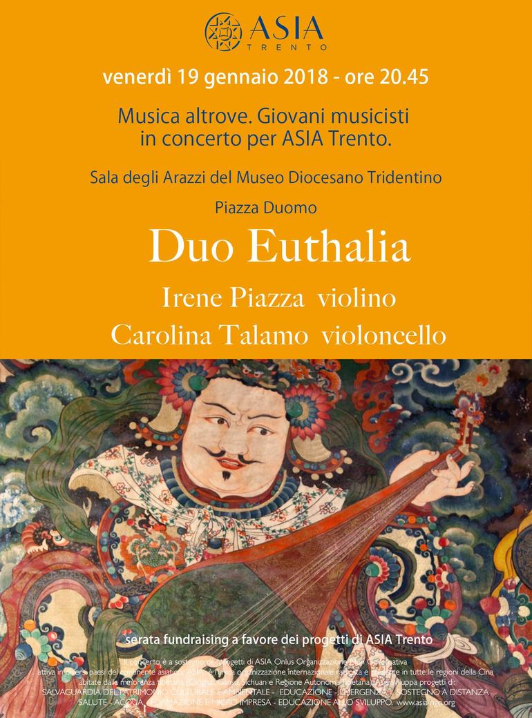 Venerdì 19 gennaio alle 20.45 si terrà il terzo concerto della rassegna Musica altrove, un evento organizzato dall’Associazione Asia Trento in collaborazione con il Museo Diocesano Tridentino. L’iniziativa vedrà esibirsi il Duo Euthalia composto da Irene Piazza al violino e Carolina Talamo al violoncello.
