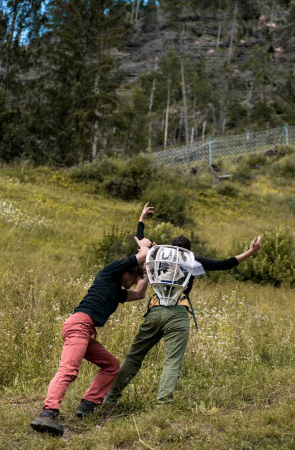 Due corpi in relazione tra loro indagano la salita con l’aiuto di sculture sonore che, indossate come due insoliti zaini, propongono una sensazione sonora e visuale completamente diversa di immersione nella natura.