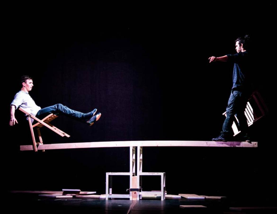 Le assi, la trave, le costruzioni di legno creano e distruggono le immagini su cui si arrampica questo spettacolo poetico ed ipnotico. Vincere è saper padroneggiare l’equilibrio: per farlo, un atto di fiducia. Il rischio è accettato come semplice parte delle regole del gioco: Il fiato del pubblico è sospeso insieme a quello degli equilibristi fino al compimento di quest’esercizio estetico sulle leggi della fisica gravitazionale.