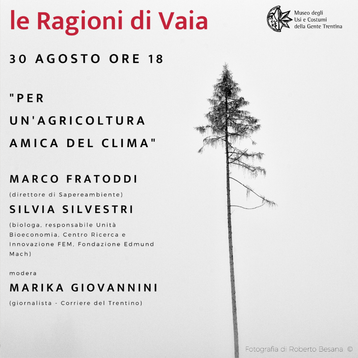 È in calendario alle 18 di martedì 30 agosto la quarta conferenza del ciclo “le Ragioni di Vaia”. Relatori di questo nuovo appuntamento sono Silvia Silvestri biologa, responsabile dell’Unità Bioeconomia del Centro Ricerca e Innovazione della FEM, Fondazione Edmund Mach e Marco Fratoddi direttore di Sapereambiente. A moderare l’incontro la giornalista del Corriere del Trentino Marika Giovannini. A fine incontro sarà proposto un brindisi con i vini della Cantina La-Vis e Valle di Cembra, divenuta, da poco, partner del Museo. A coloro che decideranno di partecipare a una o più conferenze del ciclo “le Ragioni di Vaia”, il Museo offre un biglietto d’entrata alla tariffa speciale di 1 € - da usare entro il 29 ottobre - per visitare le collezioni e vivere l’esperienza sonora “i Suoni di Vaia”.