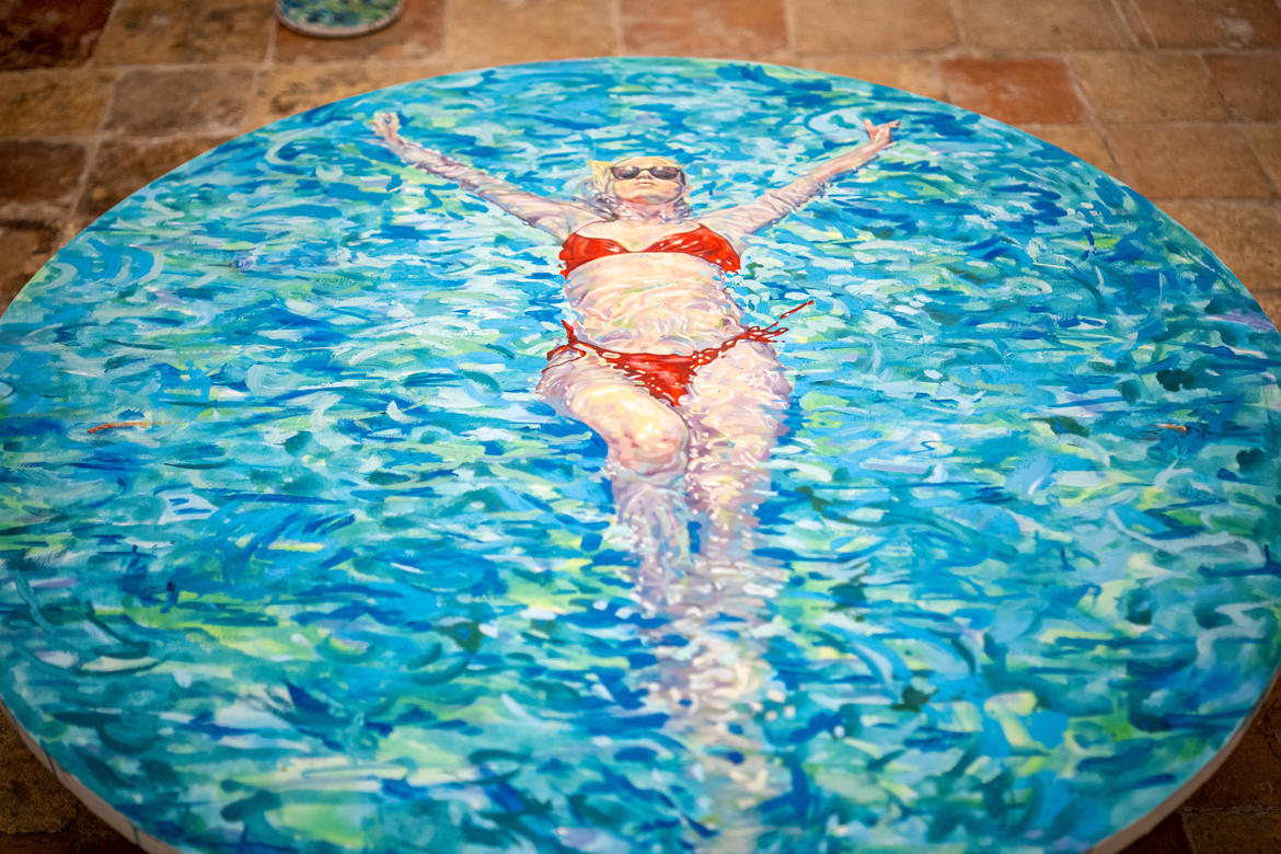 L’installazione di Igor Molin è composta da un serie di quadri nei quali il denominatore comune è l’acqua che, posizionati all’entrata della chiesa a diverse altezze, fluttuano nell’alta marea, obbligando il pubblico ad immergersi e ad avvicinarsi, talmente vicino da scorgere tra le pennellate piccole serpi, piccole crepe, minuscole presenze che rimandano all’inquinamento e alla paura di perdere la natura meravigliosa dell’ambiente marino.