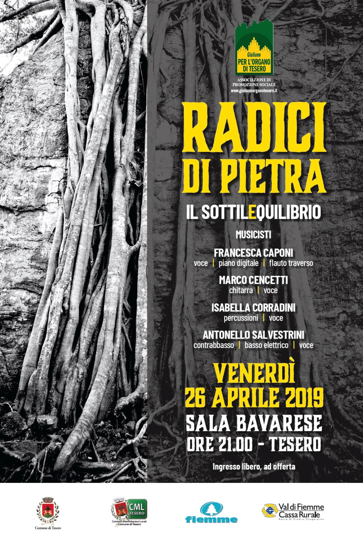 Radici di Pietra è una novella fatta di materia, che racconta di azioni, di colori, di sensazioni in un girotondo che inesorabile arriva dove era partito. La performance segue un testo narrato che si interrompe a tratti per lasciare spazio alle canzoni, pur essendone esso stesso parte; i brani descrivono dei momenti, sono pezzi di un puzzle che non sarà per forza sempre lo stesso. Lo spettacolo è inedito, testi e musica composti dal gruppo Il Sottilequilibrio.