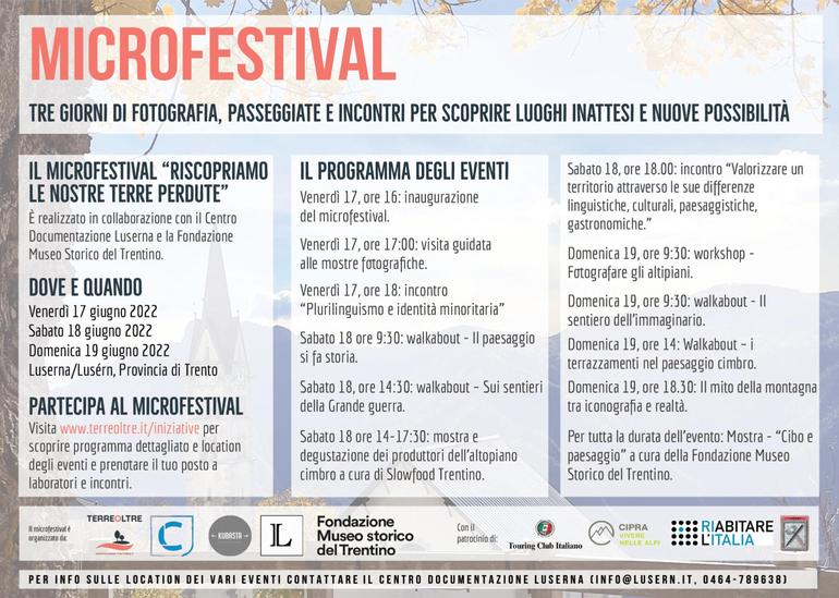 Realizzato dall’Associazione culturale Terreoltre in stretta collaborazione con il Centro Documentazione Luserna , la Fondazione Museo Storico del Trentino e il Comune di Luserna, il microfestival ha il patrocinio tra gli altri del Touring Club Italiano , dell’Associazione Riabitare l’Italia , di Slow Food Trentino e di CIPRA .