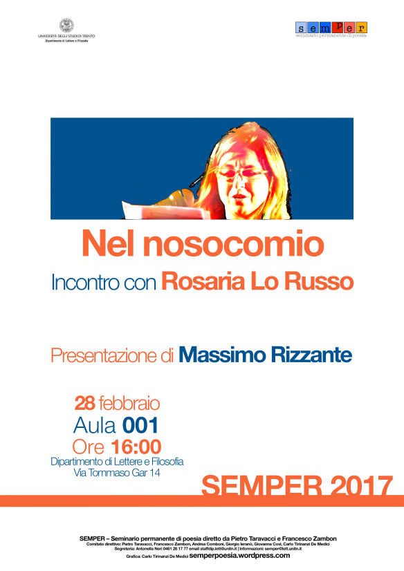 Il Dipartimento di Lettere e Filosofia avremo il piacere di ospitare la poetessa Rosaria Lo Russo. Introdurrà l’intervento Massimo Rizzante.