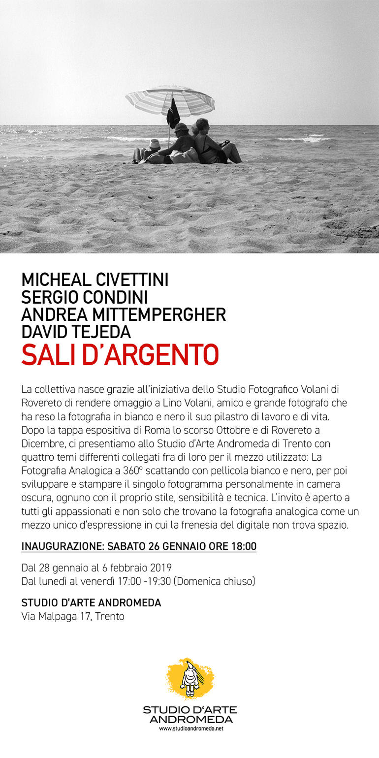 Dopo la tappa espositiva di Roma lo scorso Ottobre e di Rovereto a Dicembre, Andrea Mittempergher, Sergio Condini, David Tejeda e Micheal Civettini amici di Lino Volani, si presentano allo Studio d’Arte Andromeda di Trento con quattro temi differenti collegati fra di loro per il mezzo utilizzato: La Fotografia Analogica a 360º scattando con pellicola bianco e nero, per poi sviluppare e stampare il singolo fotogramma personalmente in camera oscura, ognuno con il proprio stile, sensibilità e tecnica. L’invito è aperto a tutti gli appassionati e non solo che trovano la fotografia analogica come un mezzo unico d’espressione in cui la frenesia del digitale non trova spazio.