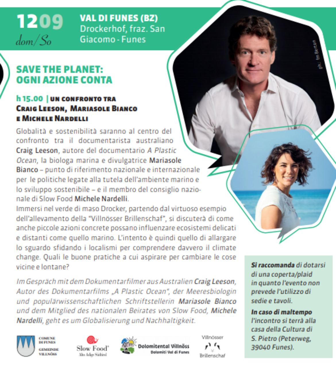 Immersi nel verde di maso Drocker, partendo dal virtuoso esempio dell’allevamento della “Villnösser Brillenschaf”, si discuterà di come anche piccole azioni concrete possano influenzare ecosistemi delicati e distanti come quello marino.